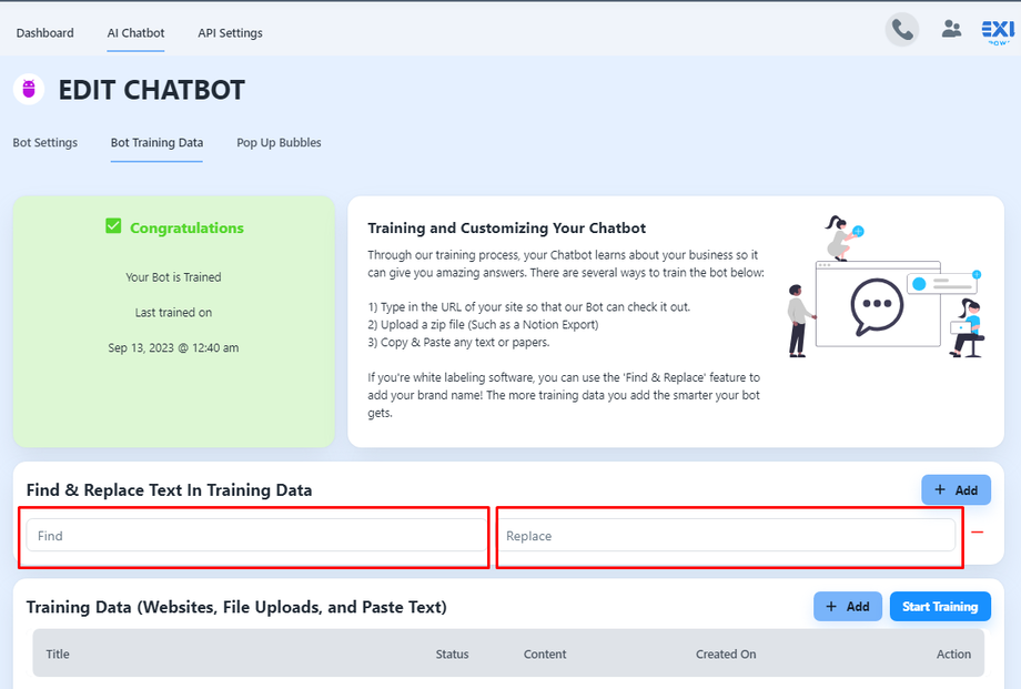Addressing company rebranding: If you purchased White Label software and want to rebrand or If your company has undergone rebranding, you can use Find & Replace to update the company name, logo, or any other relevant information in your chatbot's responses.