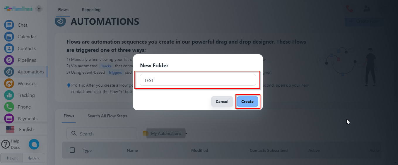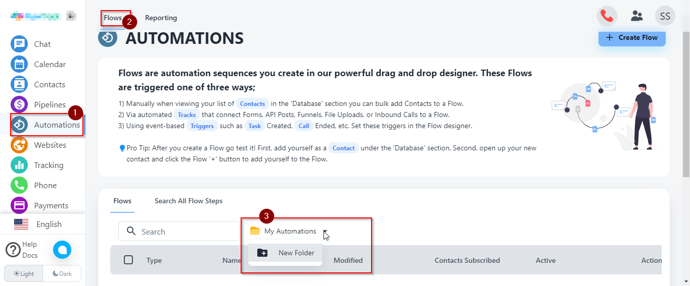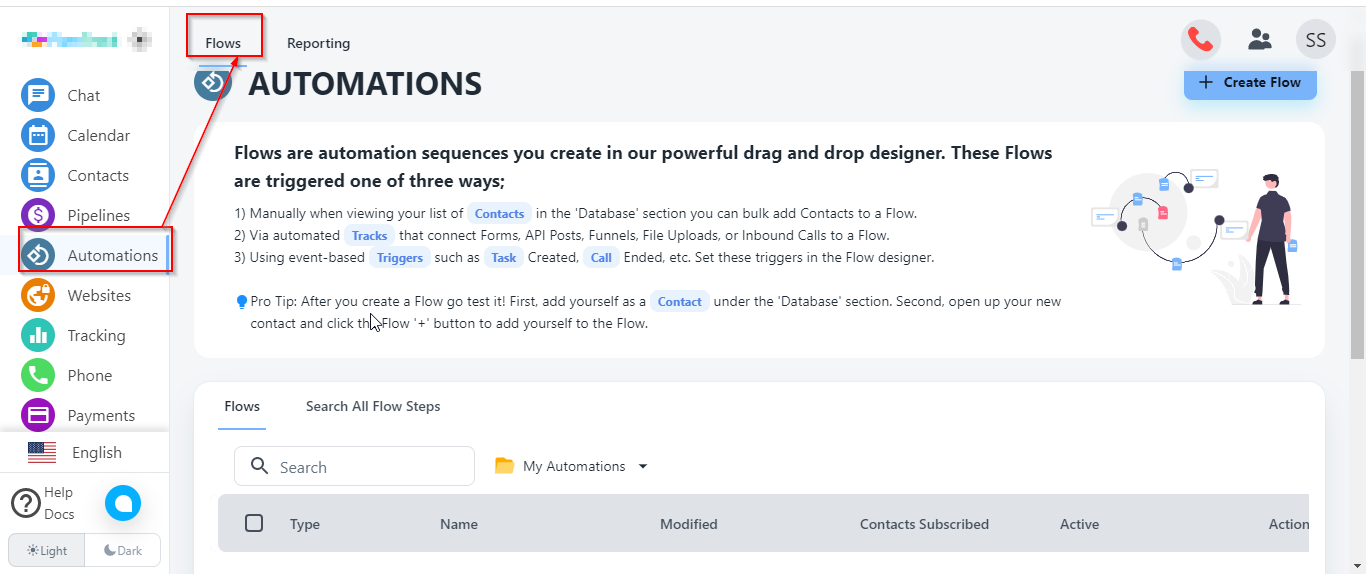 - First, you need to click on Automation from the left bar menu then click on the flows option.