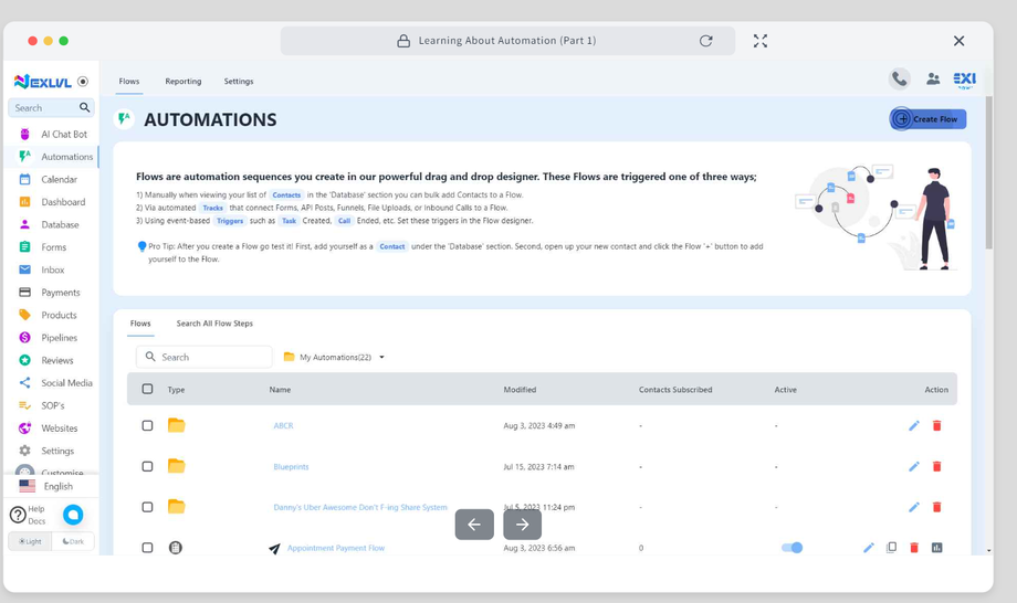 Navigate to the flow builder by clicking the “Automations” on the left side menu. Then when you have the automations page open you will see a link to “Flows” on the top of your page, please click that. Click on the ‘Create Flow’ button.