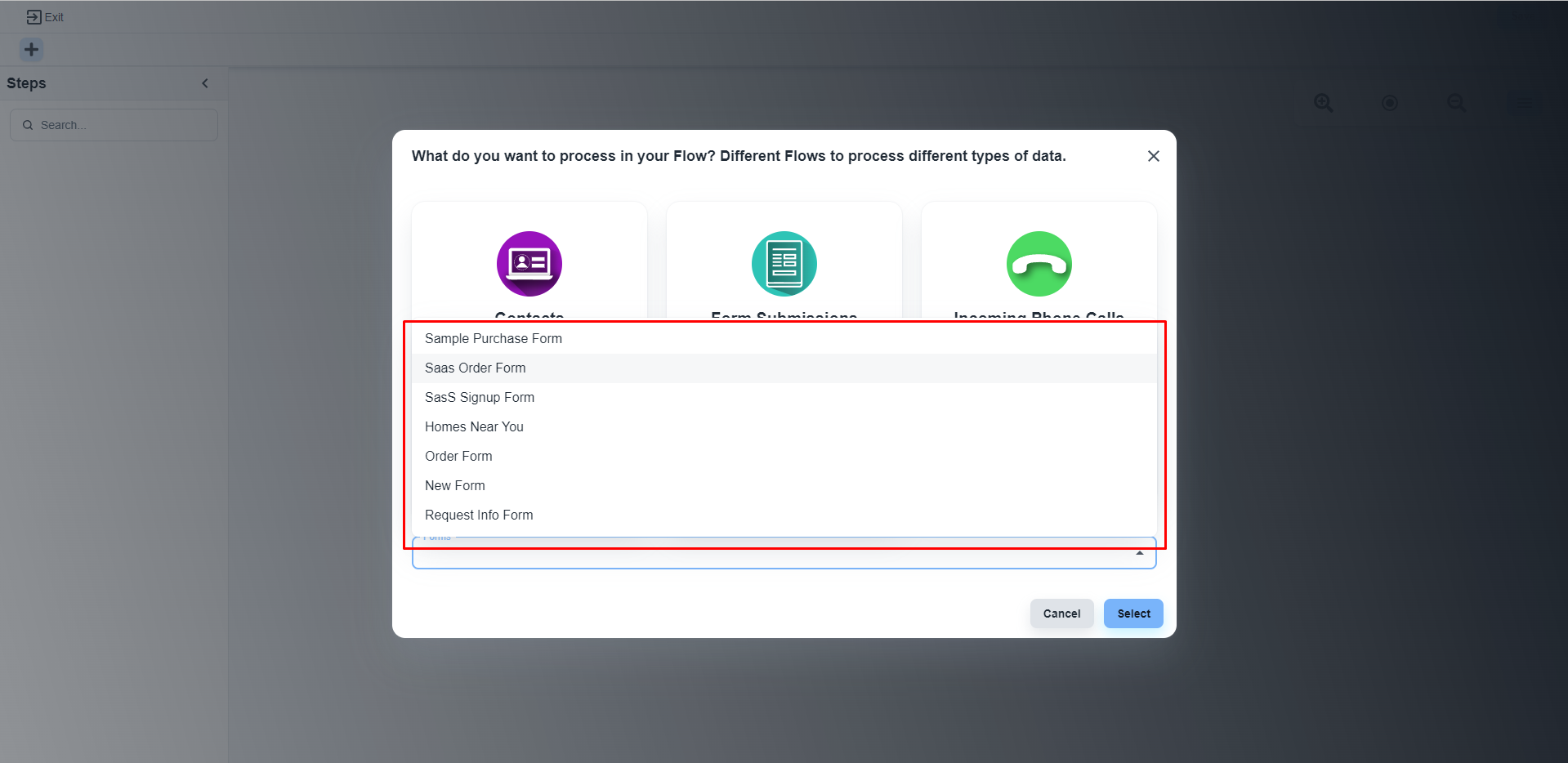 After selecting your form, please click on the ‘Select’ button to start building the flow.