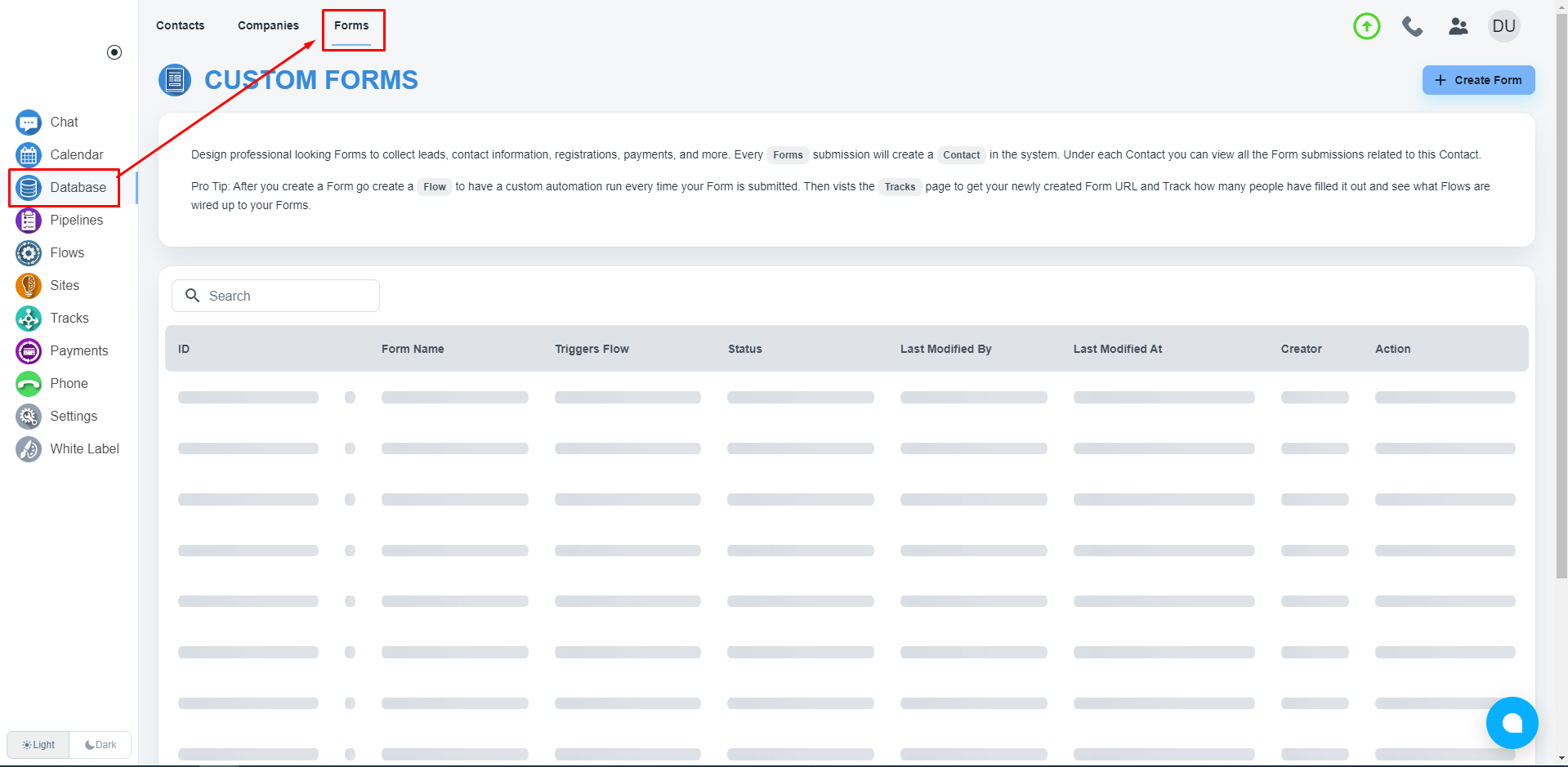 Navigate to the form builder by clicking the “Database” on the left side menu. Then when you have the database page open you will see a link to “Forms” on the top of your page, please click that. (See the image below)