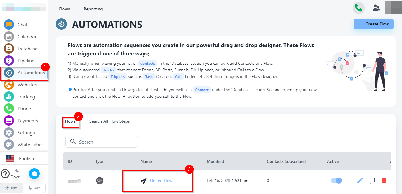 - Please, navigate to the ‘Automations ’ on the left side menu bar and create/open your flow in the flow editor.