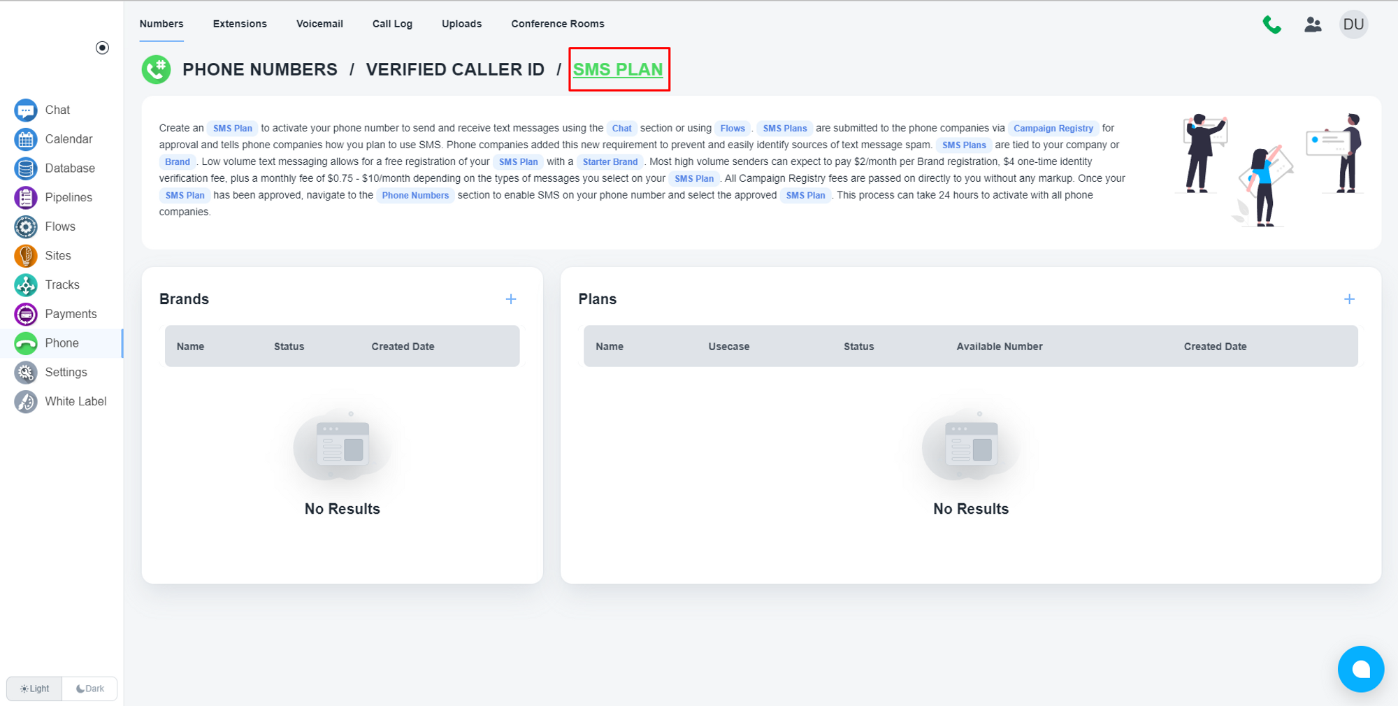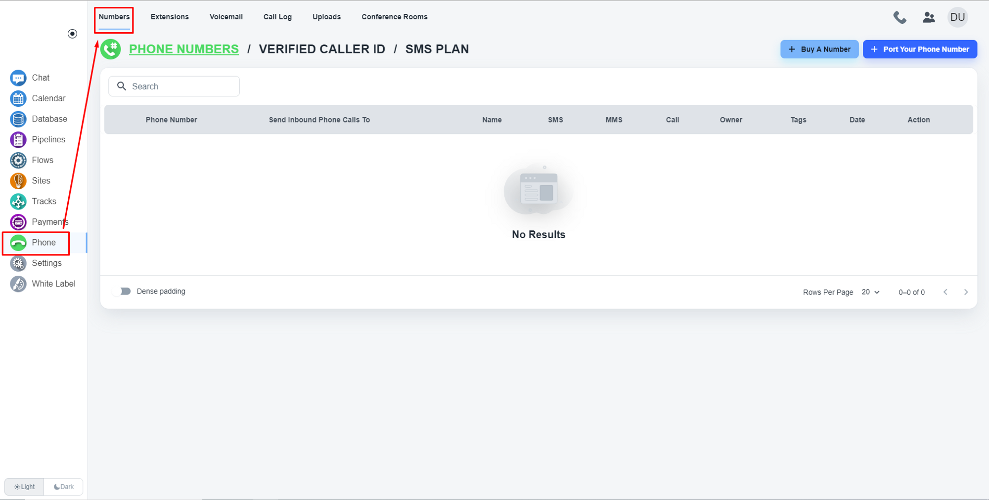 - Please navigate the phone number section by clicking on the ‘Phone’ on the left-side menu. When the page is open, click the ‘Numbers’ button on the top menu.