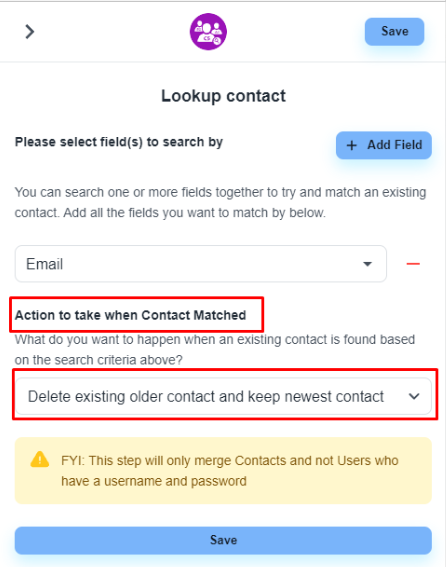 For the dropdown ‘Action to take when Contact Matched’, please select the value ‘Delete existing older contact and keep the newest contact’