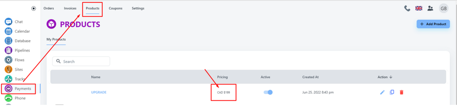 Please, navigate to the ‘Payments’’ on the left menu bar. Once the page is loaded, click on the ‘Products’ on the top menu bar.