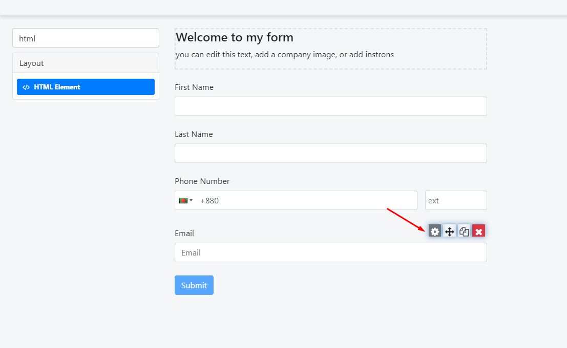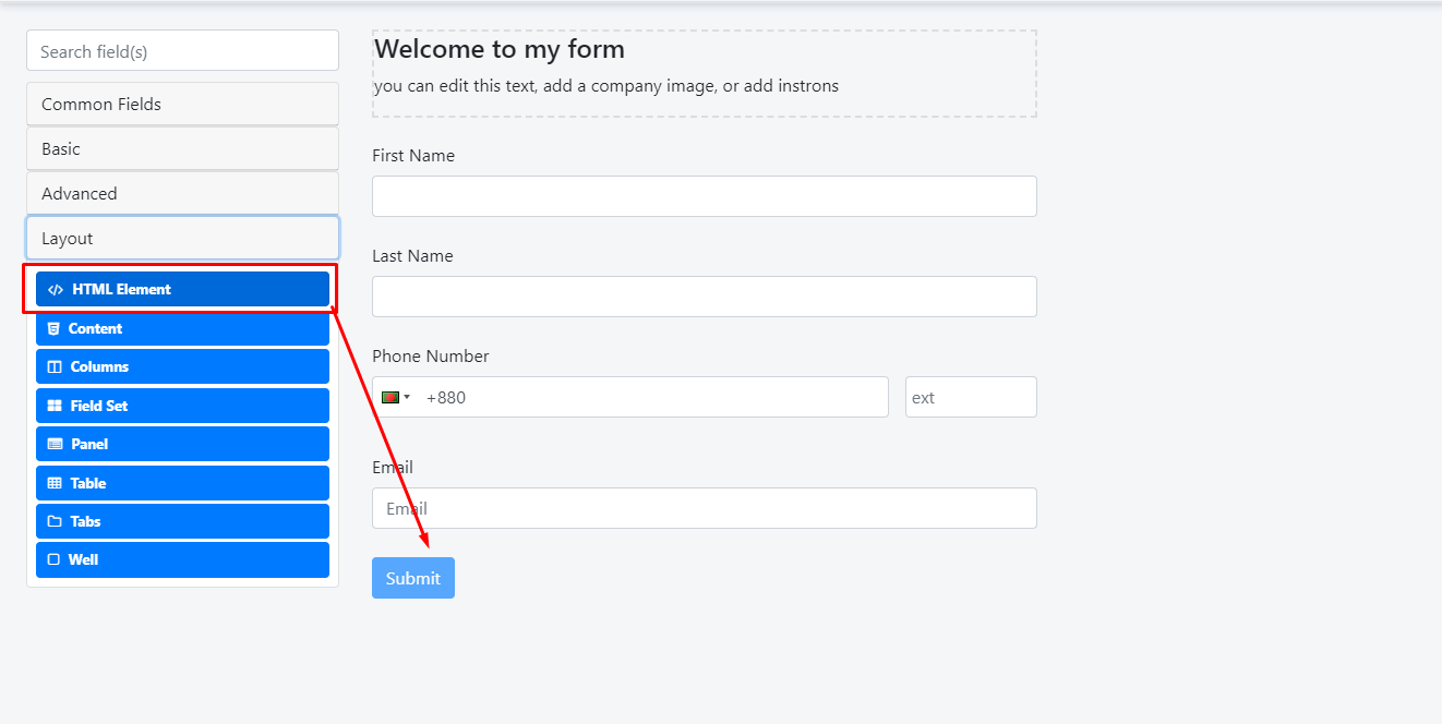 Under the ‘Layout’ section, we have the ‘HTML Element’. Please, drag that element to the form