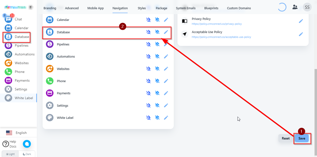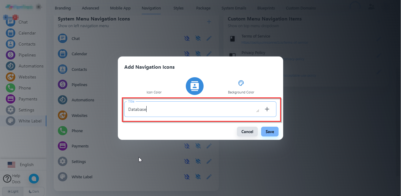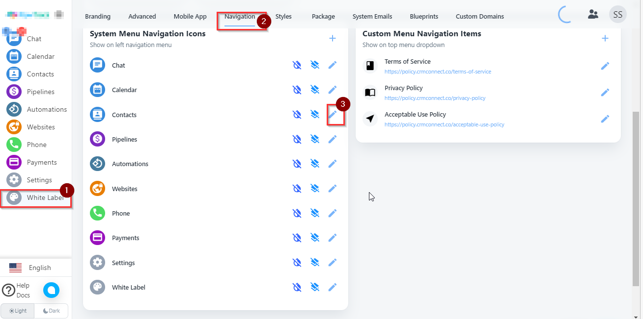 - Select White label option from left side of menu than click on navigation option. Select edit option from here. Here I can edit contact with database.