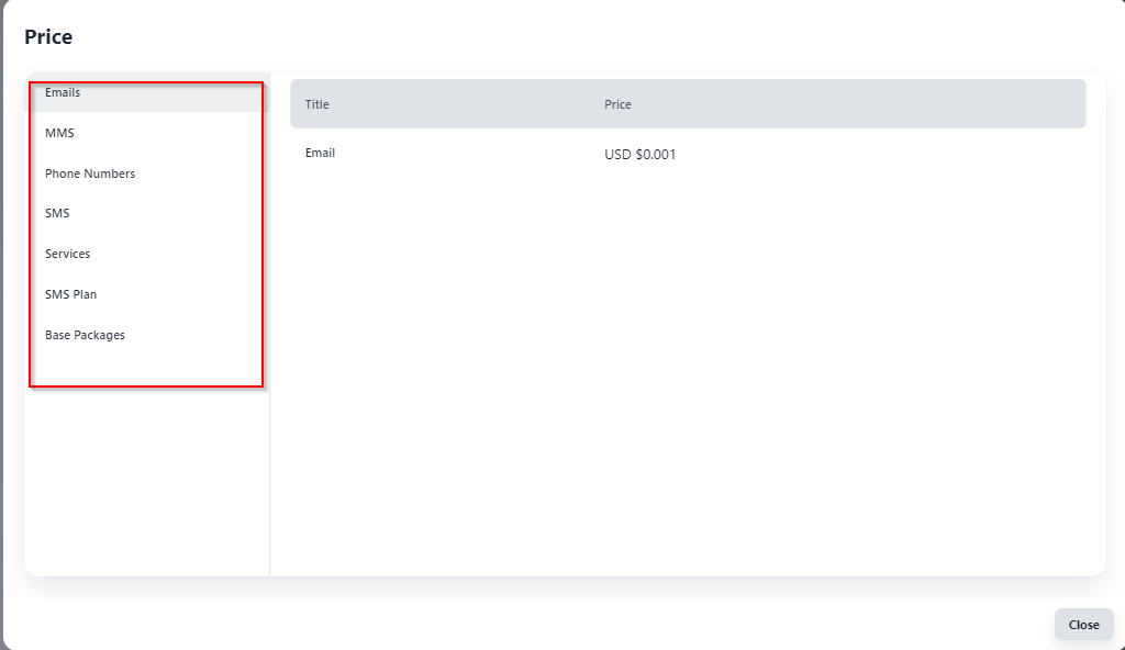 2. Here are the prices related to Emails, MMS, SMS, Phone Numbers, Services, SMS Plan & Base Packages.