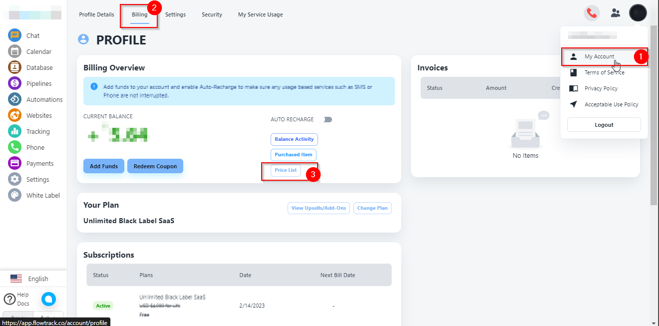 1. To see the prices, click on 'My Account', then click on the 'Billing' option at the top. You will see the details, and from there, click on 'Price List'.