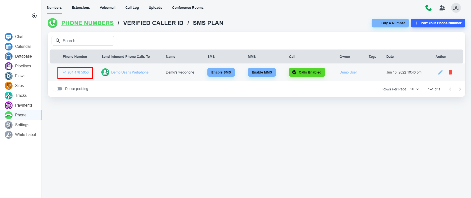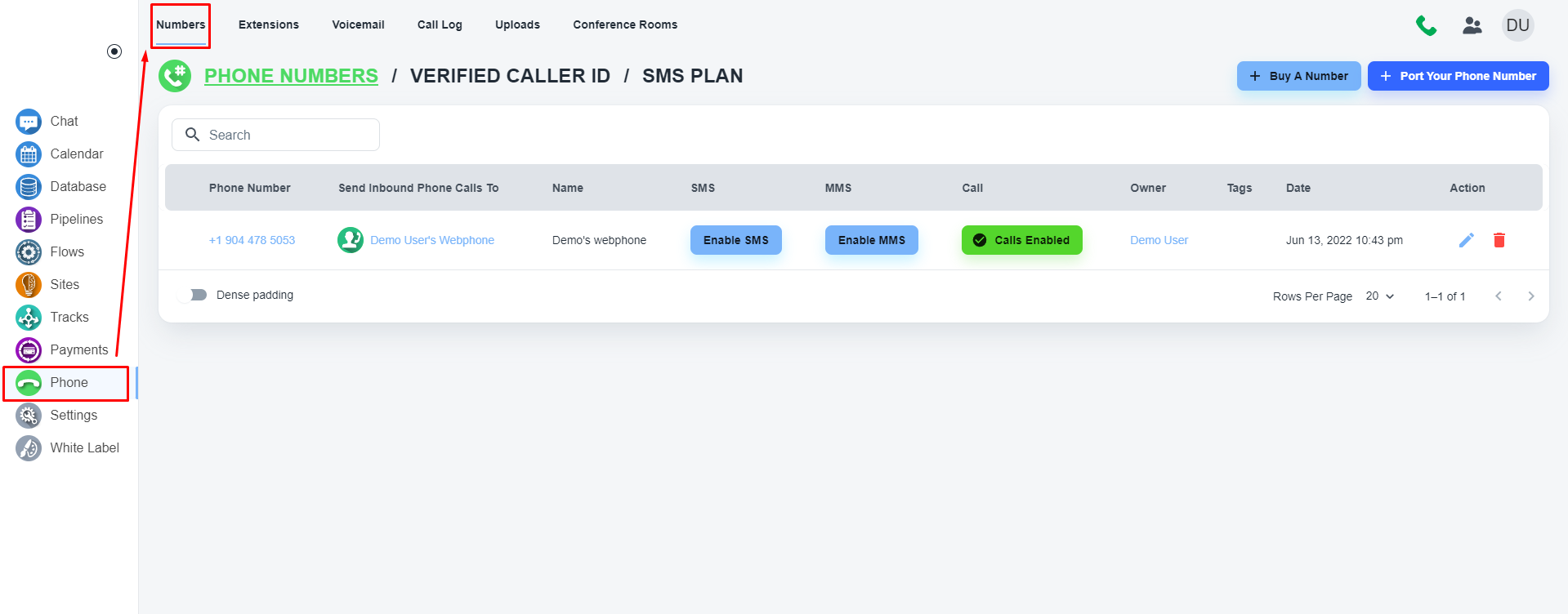 Please navigate the phone number section by clicking on the ‘Phone’ on the left-side menu. When the page is open, click the ‘Numbers’ button on the top menu.
