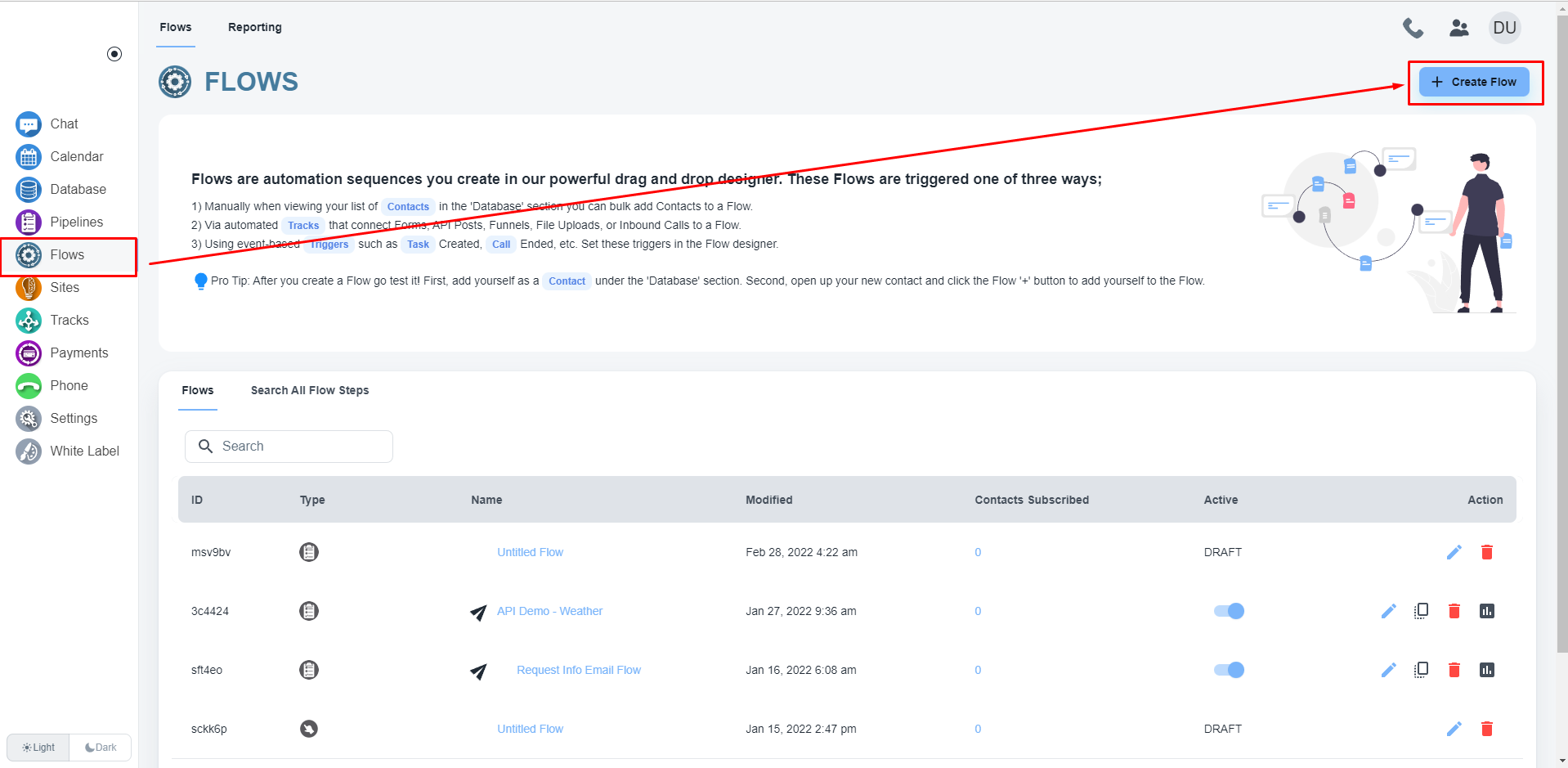 Navigate to the flow builder by clicking the “Flows” on the left side menu. Then when you have the flow page open you will see a link to “Flows” on the top of your page, please click that. Click on the ‘Create Flow’ button.