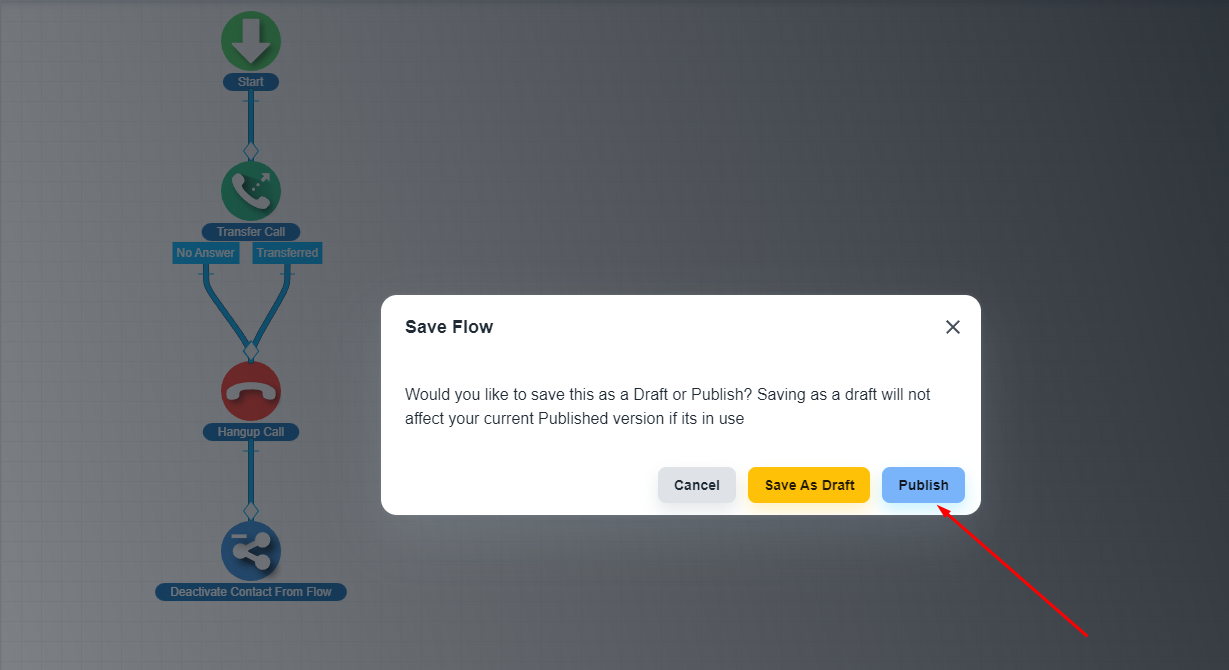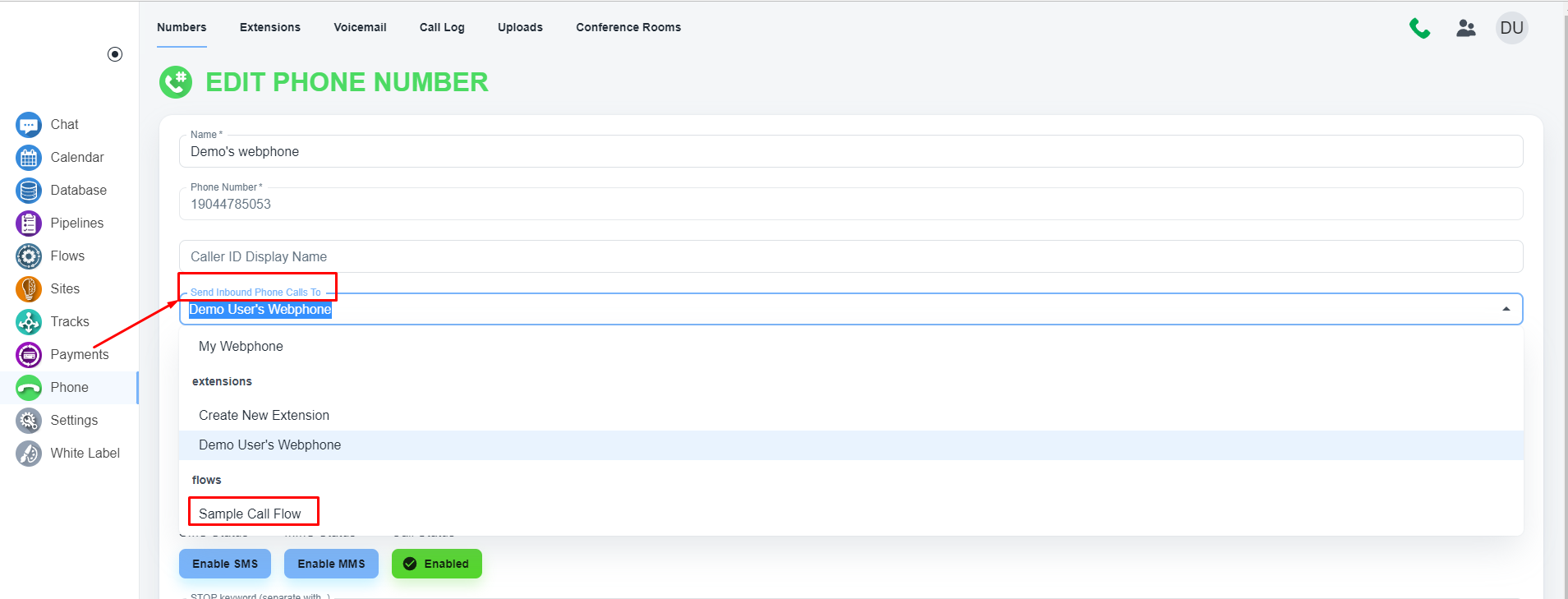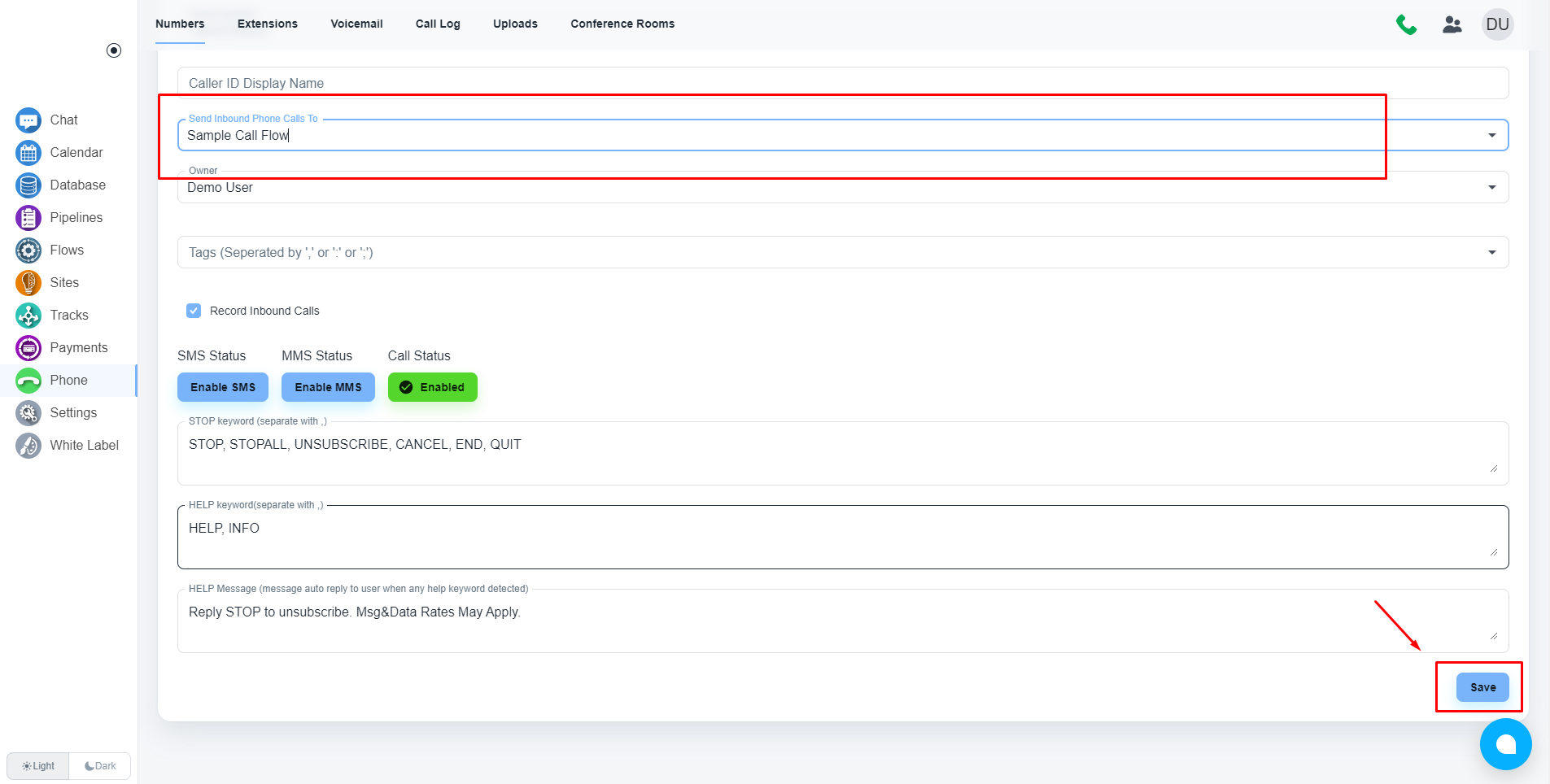 Please, select the ‘Send Inbound Phone Calls To’ dropdown, and the system will provide you with a list containing existing call flows. Please, select the concerned flow.