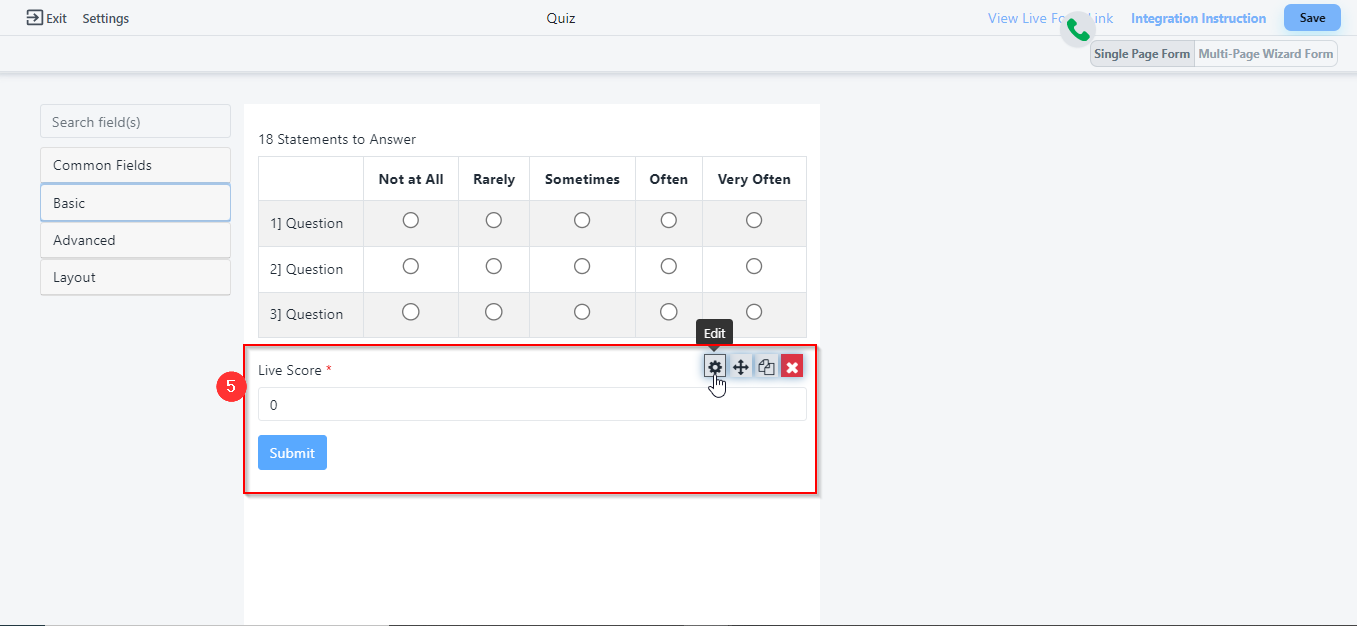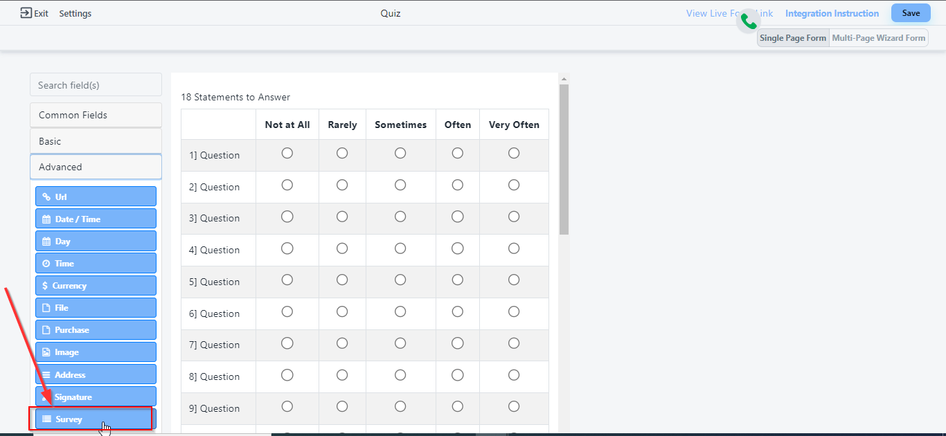 - Select Survey field from the Advanced fields on the left side of your form.