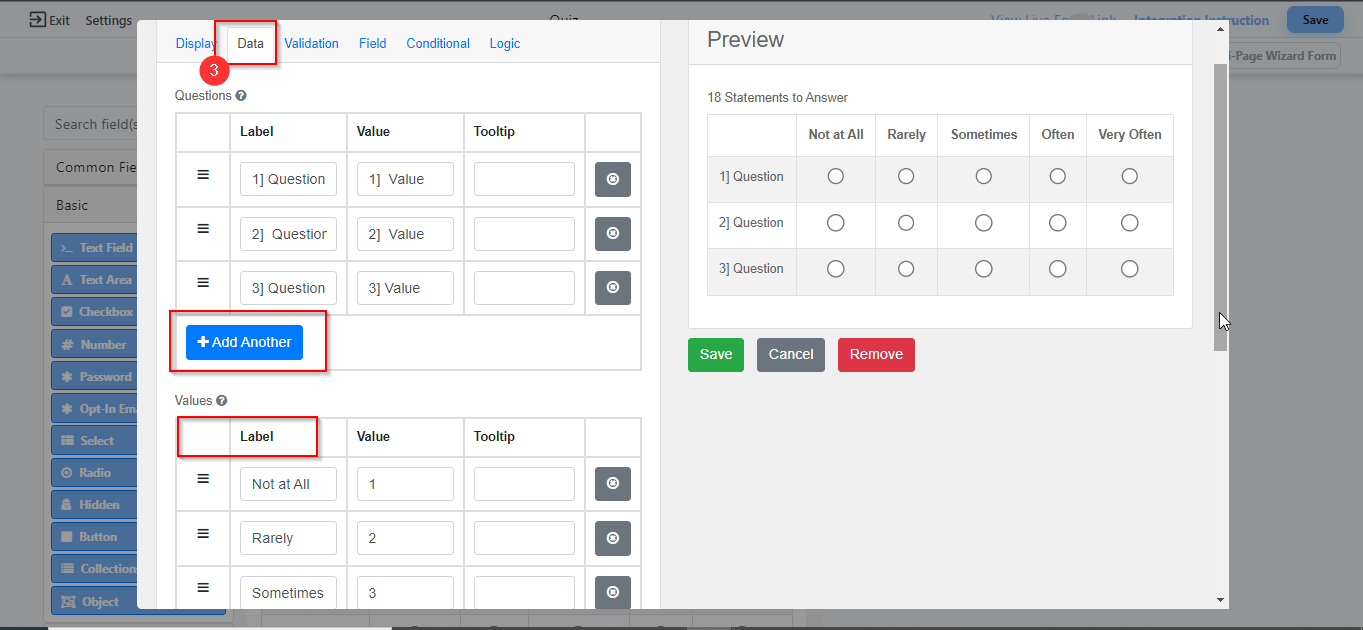 3. Add label and values for the Quiz/If you want to increase the number of Rows and Column click on “Add Another” add your requirement and save.