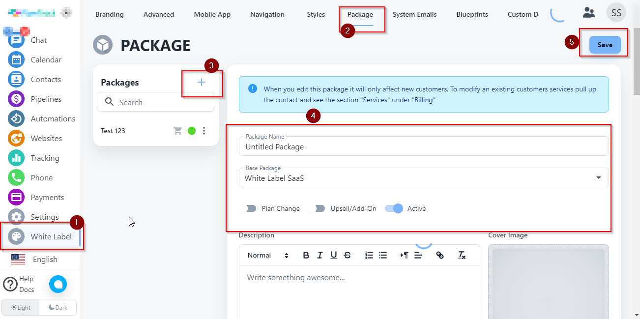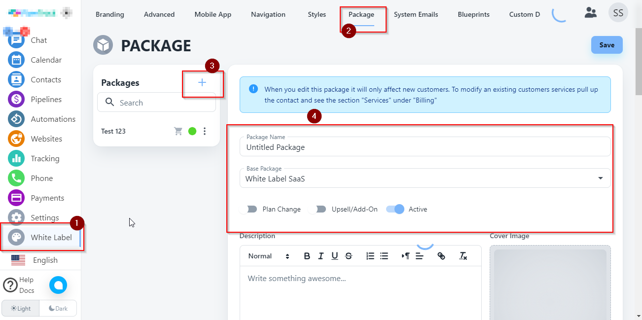 - To create a package, first click on the White Label tab from the left side, then click on the Package option from the top address bar.