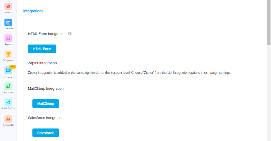 Different Integrations availble within the system are: HTML Form, MailChimp Integration, Salesforce Integration, Keap (Infusionsoft) Integration, Aweber Integration, ActiveCampaign Integration, MailerLite Integration, ExactTarget Integration, GetResponse Integration, Moosend Integration, Platform.ly Integration, Webhook Integration, Drip Integration, and SendFox Integration.