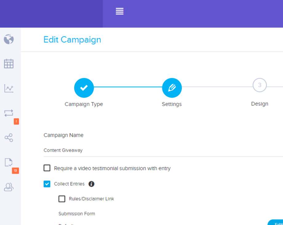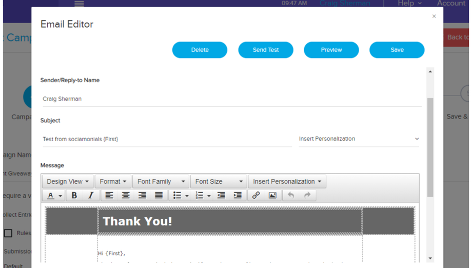 Go to Campaigns Editor > Settings. From there, find Email Notifications. Choose the email that you want to edit. Click on 'Edit' on the right side. It should open the Email Editor where you can set-up the email that your participant will receive upon submitting an entry in your campaign.
