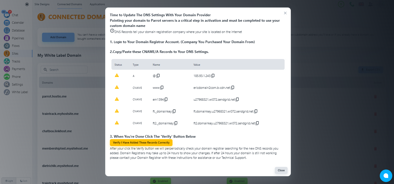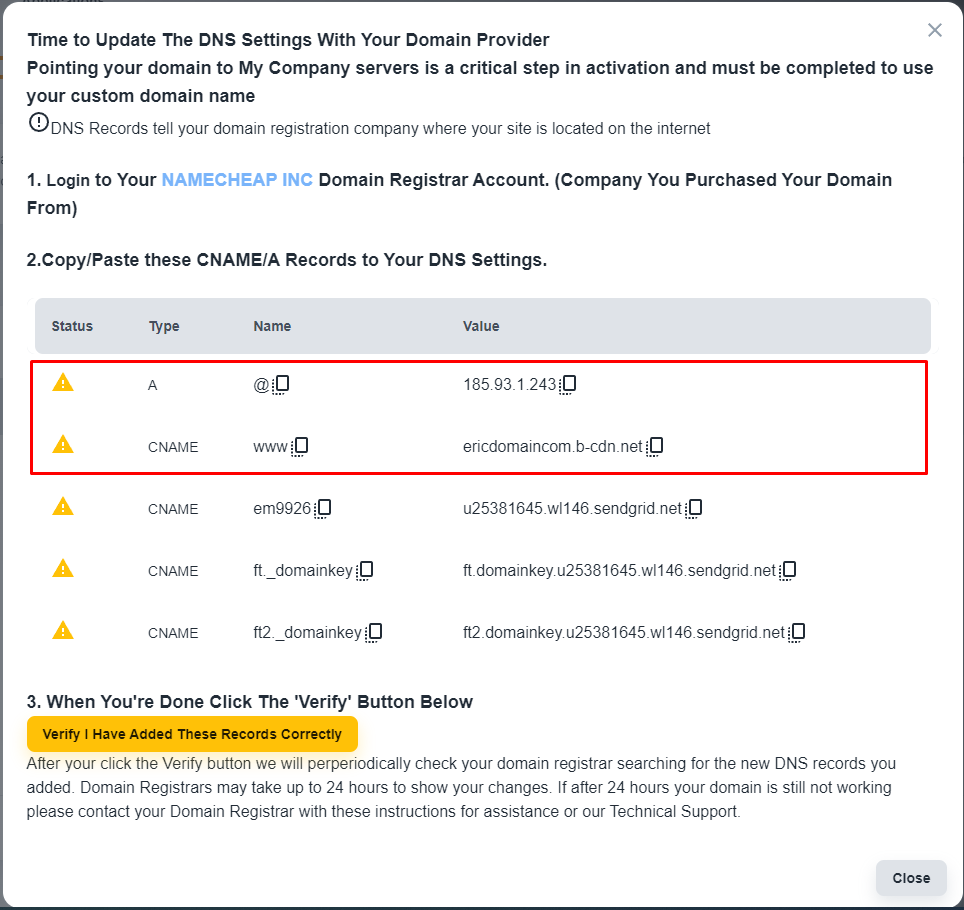Please, wait for a while. The system will provide you with the required DNS records you need to add to your domain registrar.