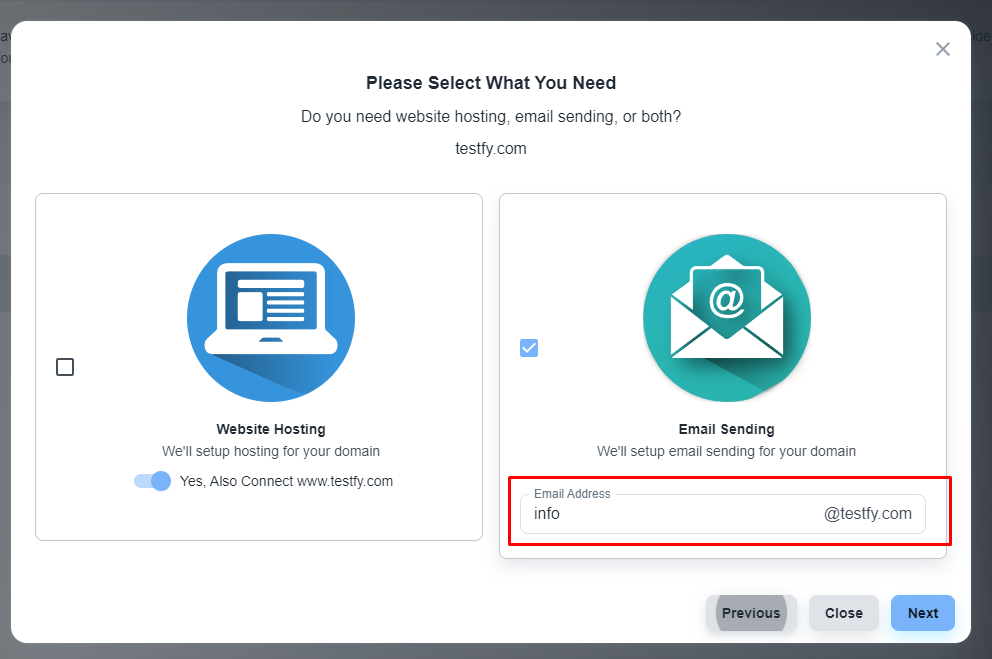 Please, uncheck the ‘Web Hosting’ and select the ‘Email sending’ option