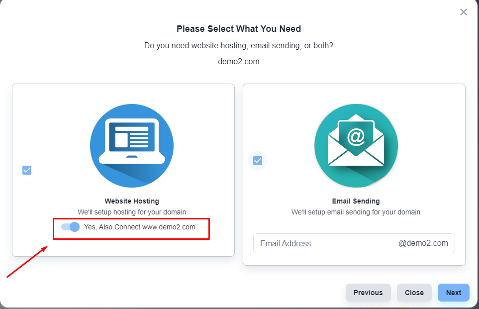 Now, the system will offer you services. By default, the Website Hosting service will be enabled.