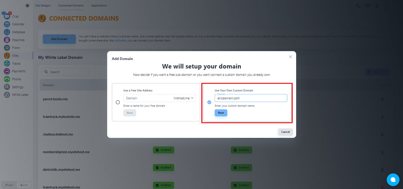 The system will allow you to add a free domain or custom domain. For our case, we will select the second option, and put your domain name.