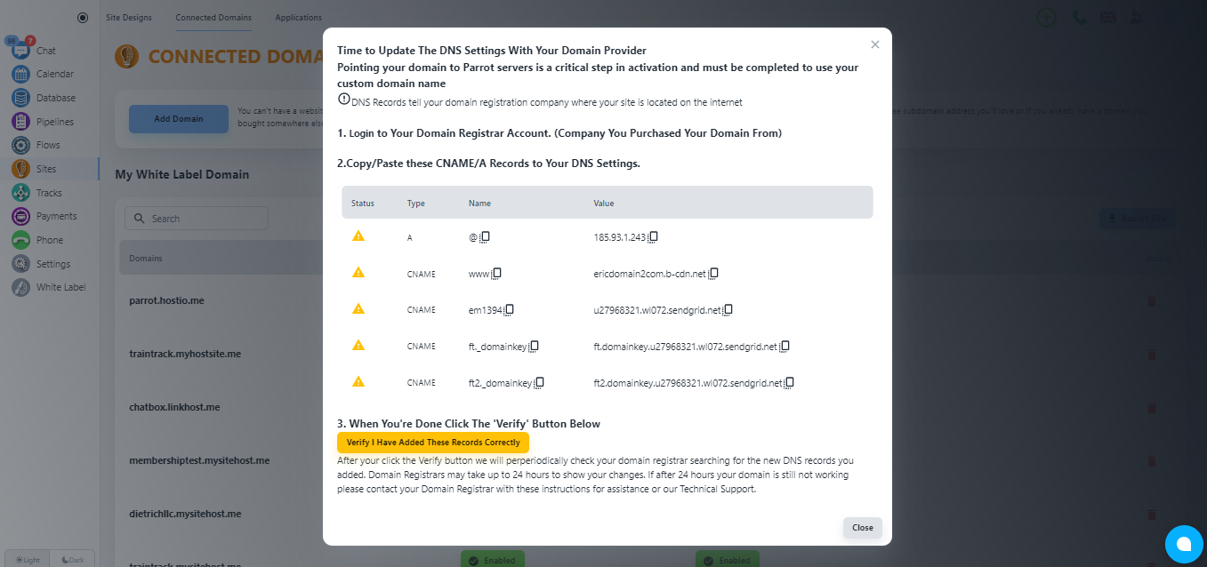 Navigate to the domain panel by clicking the “Sites” on the left side menu. Then when you have that page open you will see a link to “Connected Domains” on the top of your page, please click that.